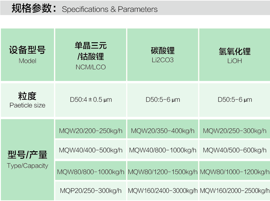 鈷酸鋰(LiCoO2)是最早商業(yè)化的鋰離子電池正極材料。具有很高的材料密度和電極壓實密度,使用鈷酸鋰正極的鋰離子電池具有最高的體積能量密度,因此鈷酸鋰是消費電子市場應(yīng)用最廣泛的正極材料。主要應(yīng)用于中高端數(shù)碼產(chǎn)品,如筆記本電腦、一線品牌手機、數(shù)碼相機等。 青島優(yōu)明科粉體機械研發(fā)制造的“MQW”系列流化床式氣流磨(氣流粉碎機),廣泛應(yīng)用于鈷酸鋰正極材料的超細(xì)粉碎領(lǐng)域。